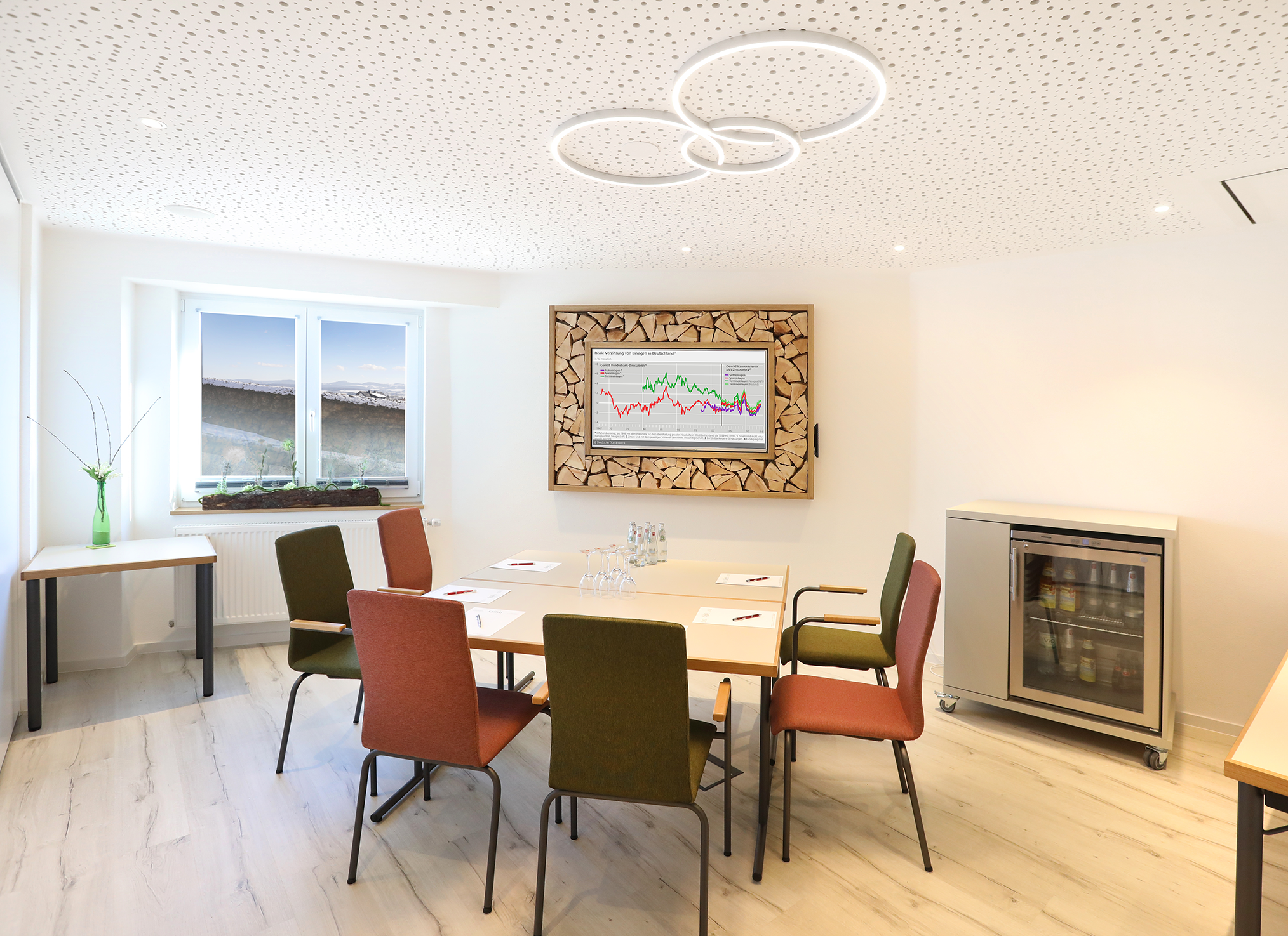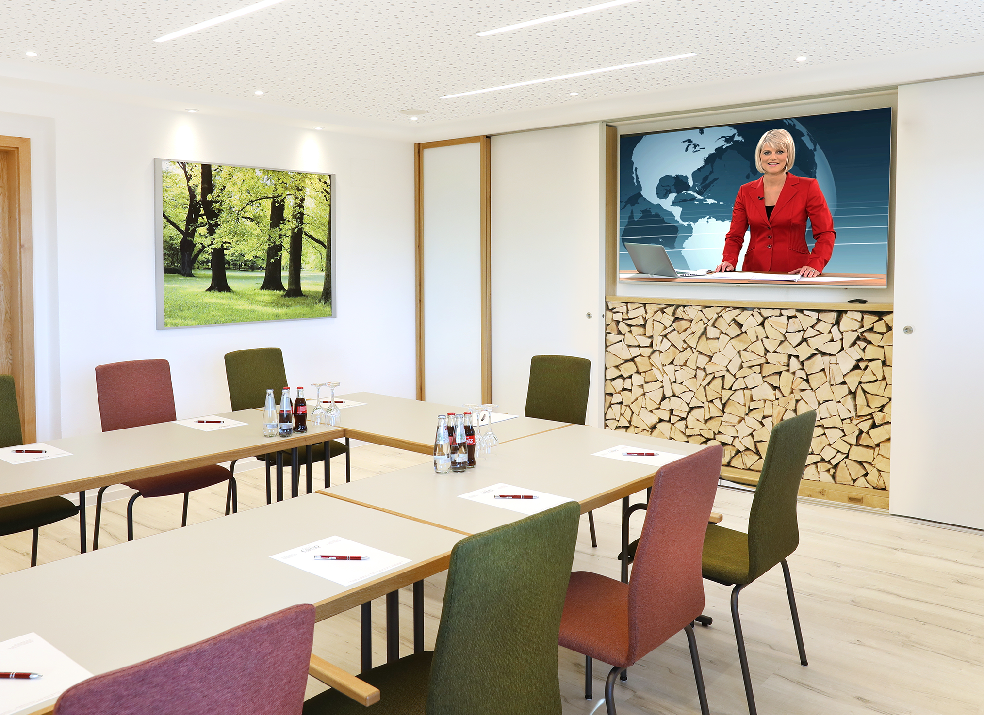 Durch eine mobile Trennwand lässt sich der große Tagungsraum "Lioba" ca. ein iviertel der Größe, zum Tagungsraum "Maulkuppe" umbauen. Ausgestattet ist der Raum mit einer Schallschutzdecke, in die die individuell dimmbare Beleuchtung integriert ist. Auf dem 65-Zoll-Multimedia-Bildschirm lässt sich alles, ob Daten, Bilder oder Filme einfach und deutlich präsentieren. Laptop oder PC werden über Bodentanks mit Strom und schnellem VDSL-Internet verbunden. Hier können bis zu 10 Leute tagen.